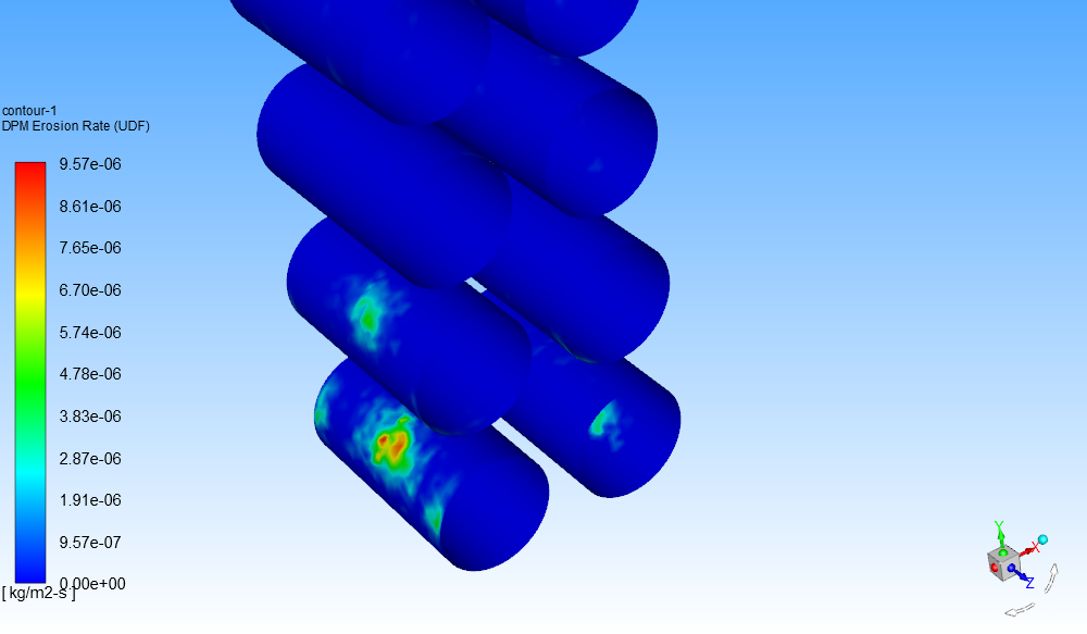 圖3-1、3-2為顆粒軌跡圖,顆粒材料為銅,質量流率較低、粒徑小、密度大,所以考慮重力和空氣曳力。由圖可知,5、7、8號三個濾筒均受到顆粒的直接沖擊。 綜上,5、7、8號濾筒均沖刷較為嚴重,其中7、8號最嚴重,主要原因為通過這兩個濾筒側面的風速過大,顆粒能量大,對濾筒撞擊能量大。