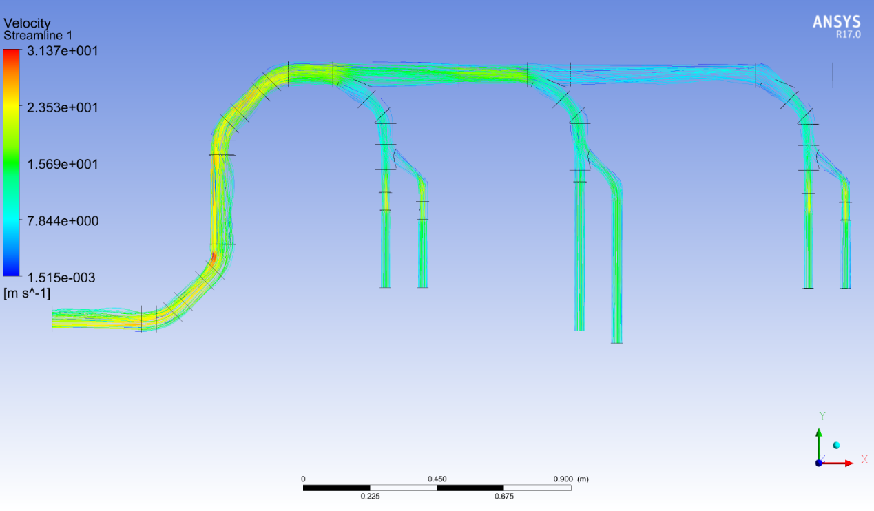 系統能耗下降原因分析:1、改進后的擾流板下方開孔,增大了氣流進入腔室的面積,2、由V型改為平板型,降低了入口處的射流強度,另外去掉的兩塊擾流板消除了相應區域的射流現象,射流的抑制降低了湍流強度,降低了氣流與壁面的摩擦作用,以及氣體之間的相互摩擦,從而降低了能量損失。