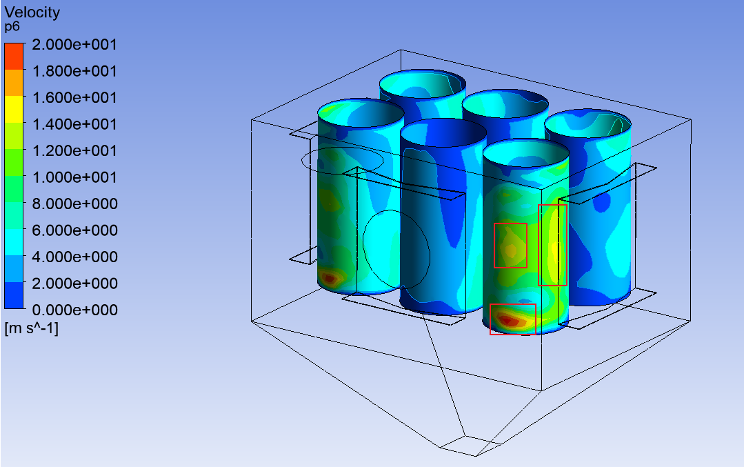 實際工作情況中,主要是1號和3號濾筒受損嚴重。由于整個系統為對稱結構,因此兩個濾筒表面情況類似,這里僅針對1號濾筒進行分析。濾筒表面風速云圖如圖2.3所示,1號濾筒三個方框的位置表面風速較高,最高接近20m/s,接近入口風速,因此這三個地方的受損比較嚴重,實際情況也確實如此。因此需要降低濾筒表面風速,即間接降低小粒徑顆粒對濾筒的沖刷速度。濾筒的表面最大風速如下表所示。